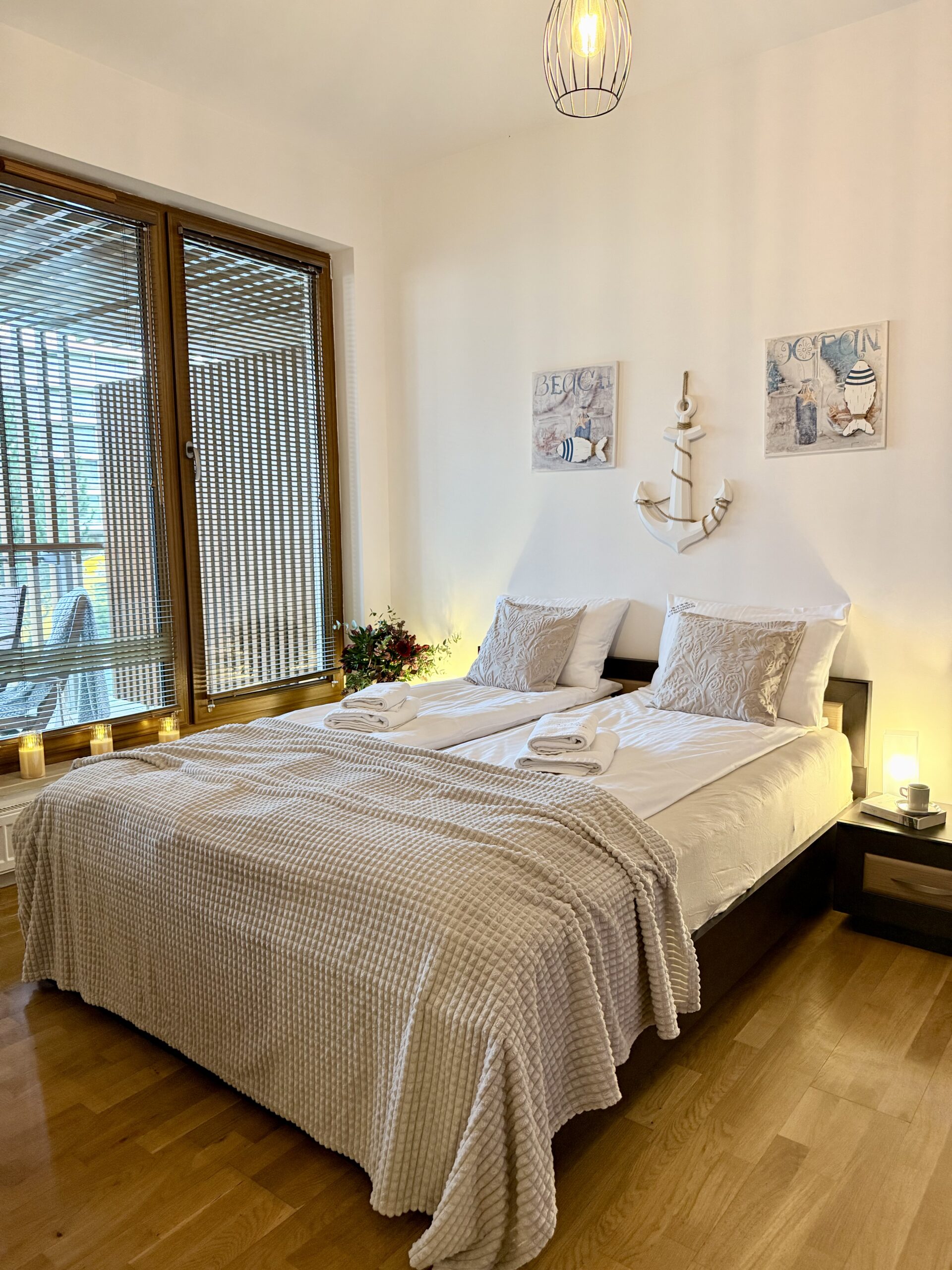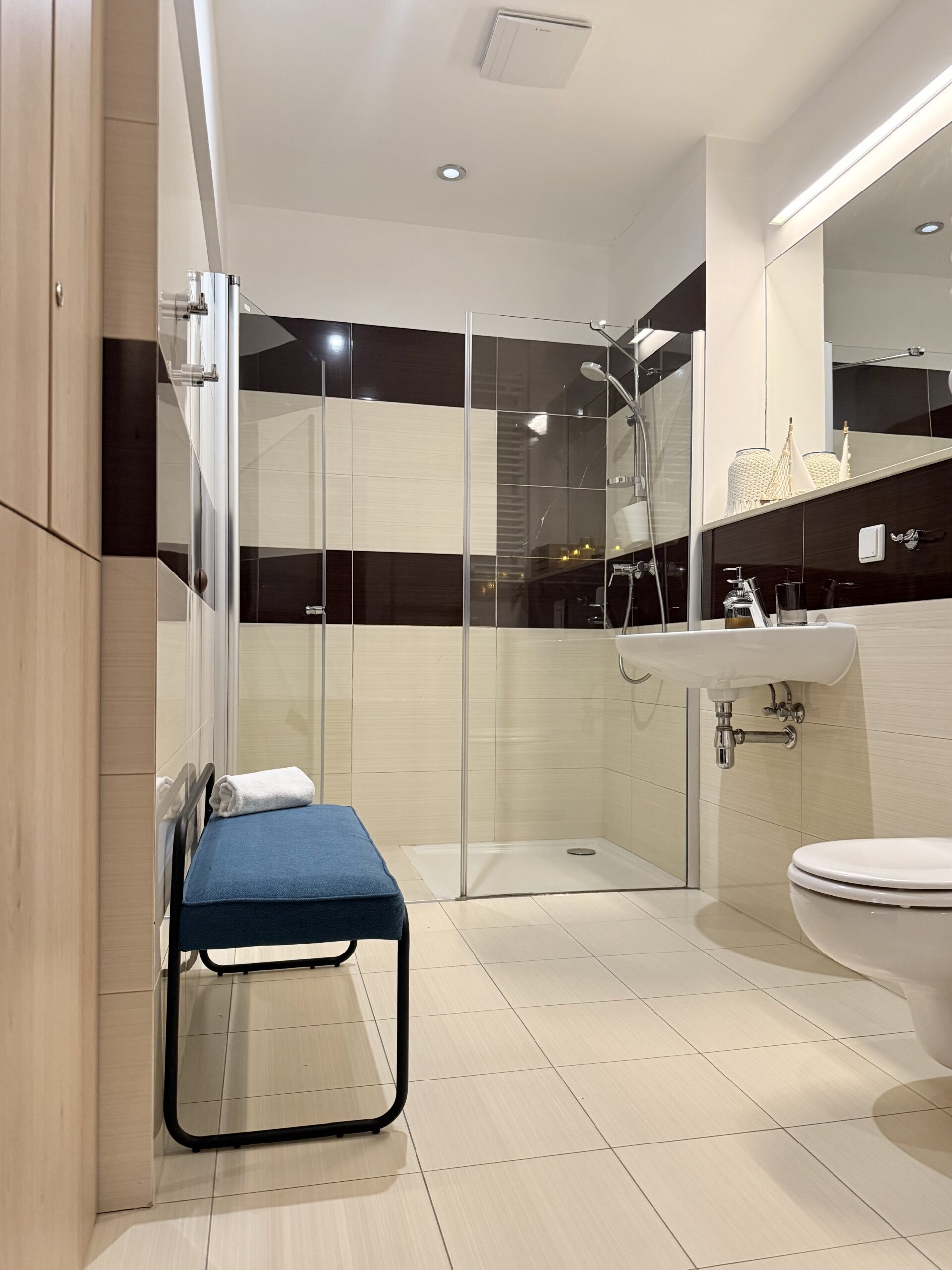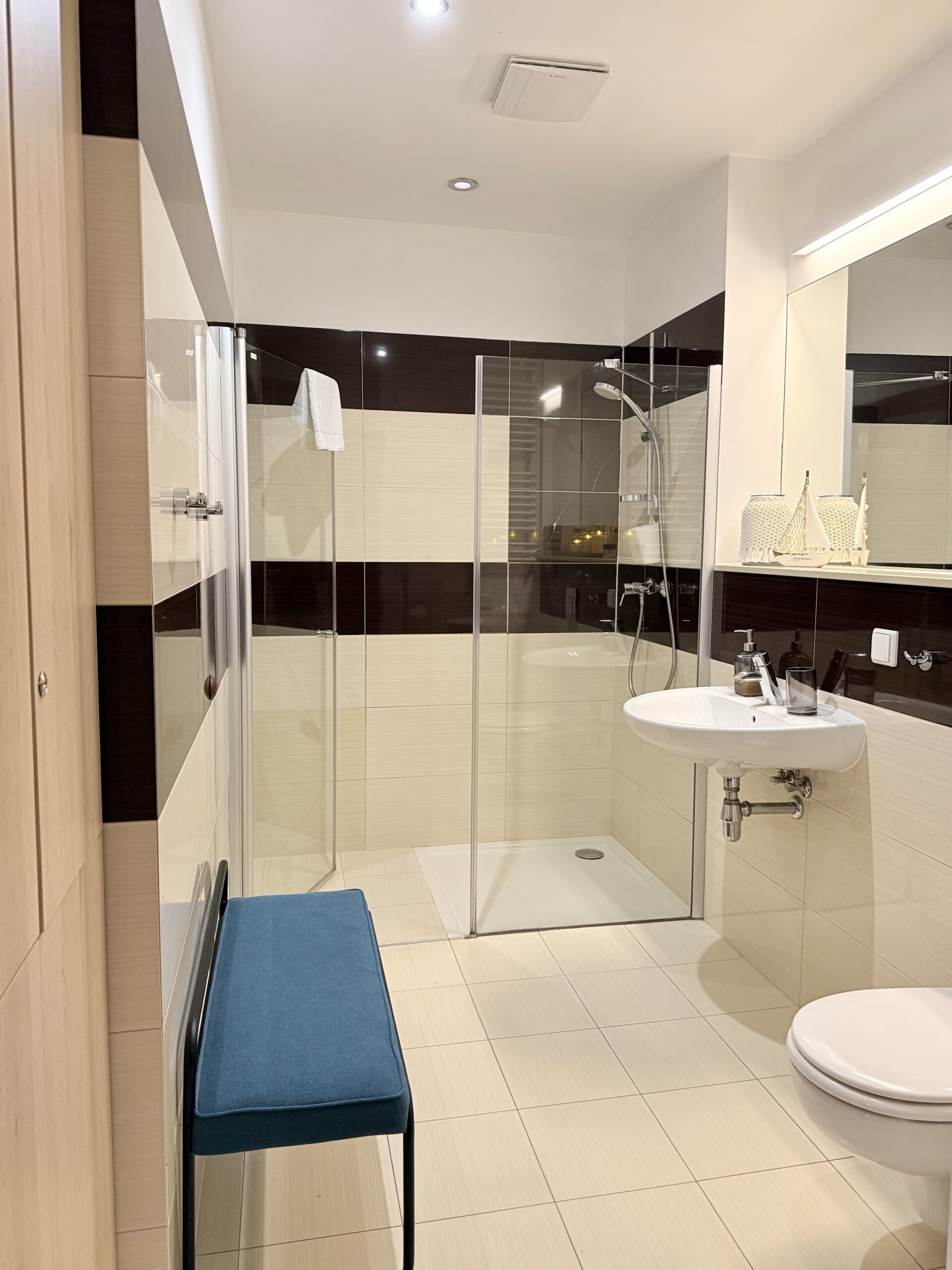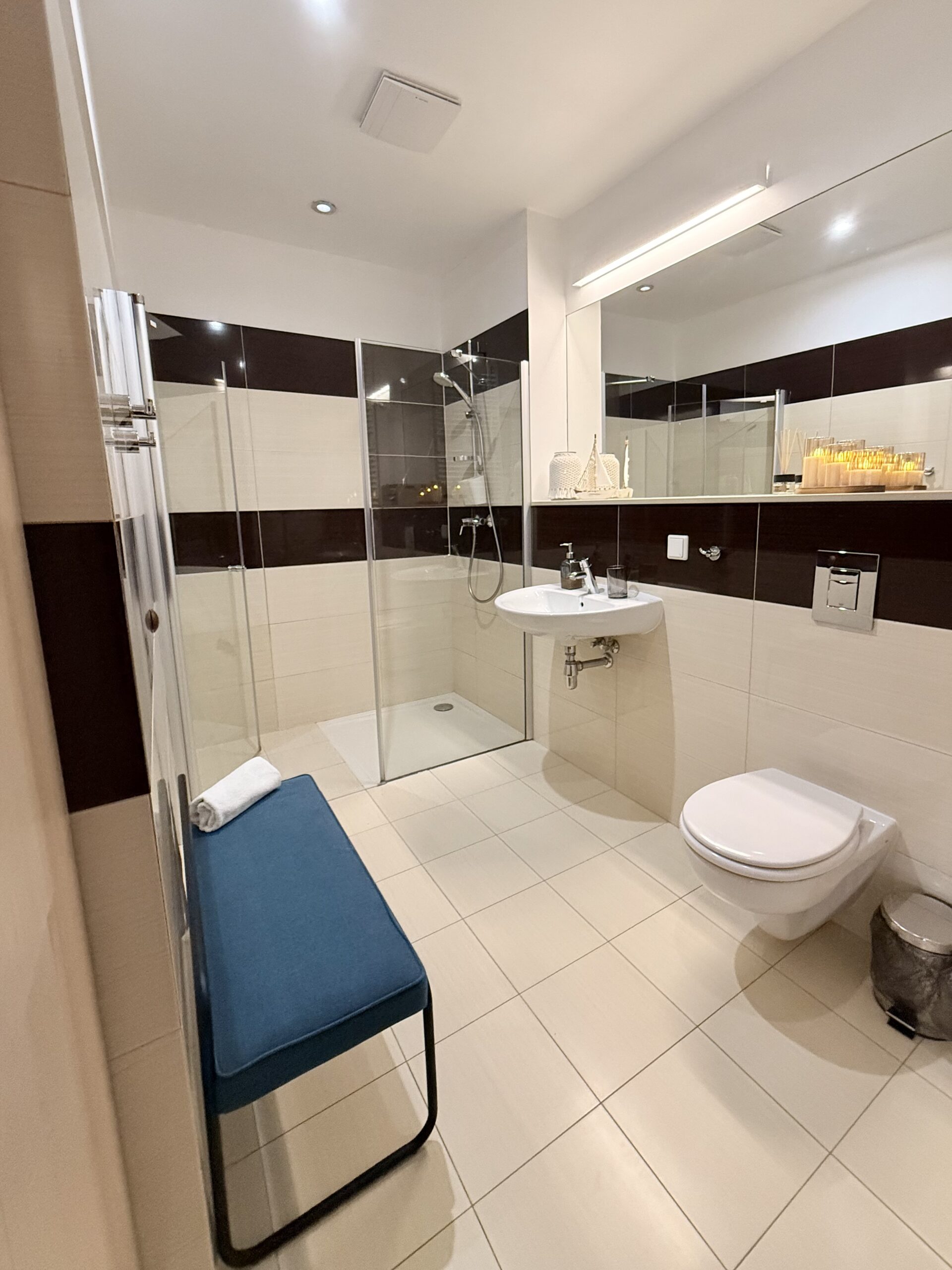 Apartament dysponuje również dużą, jasną łazienką z pralką, co jest szczególnie wygodne podczas dłuższych pobytów.