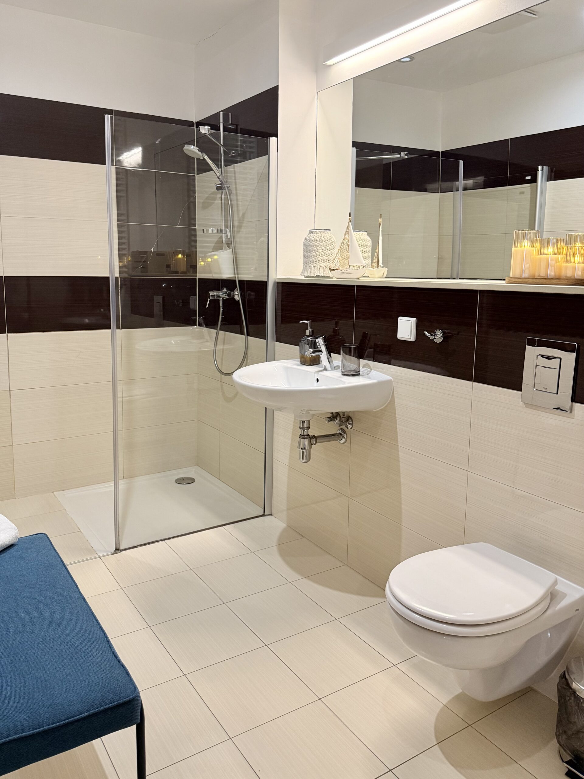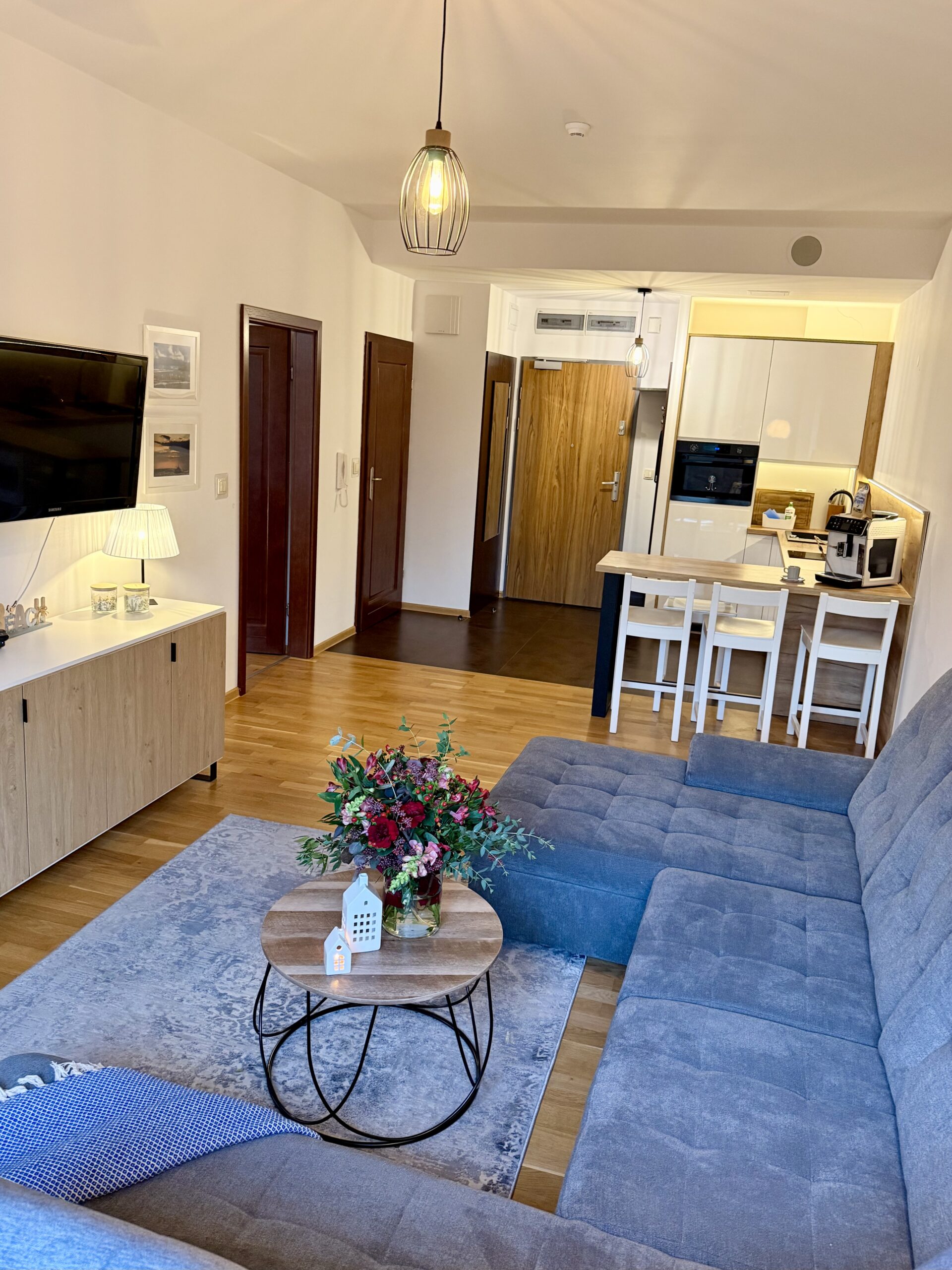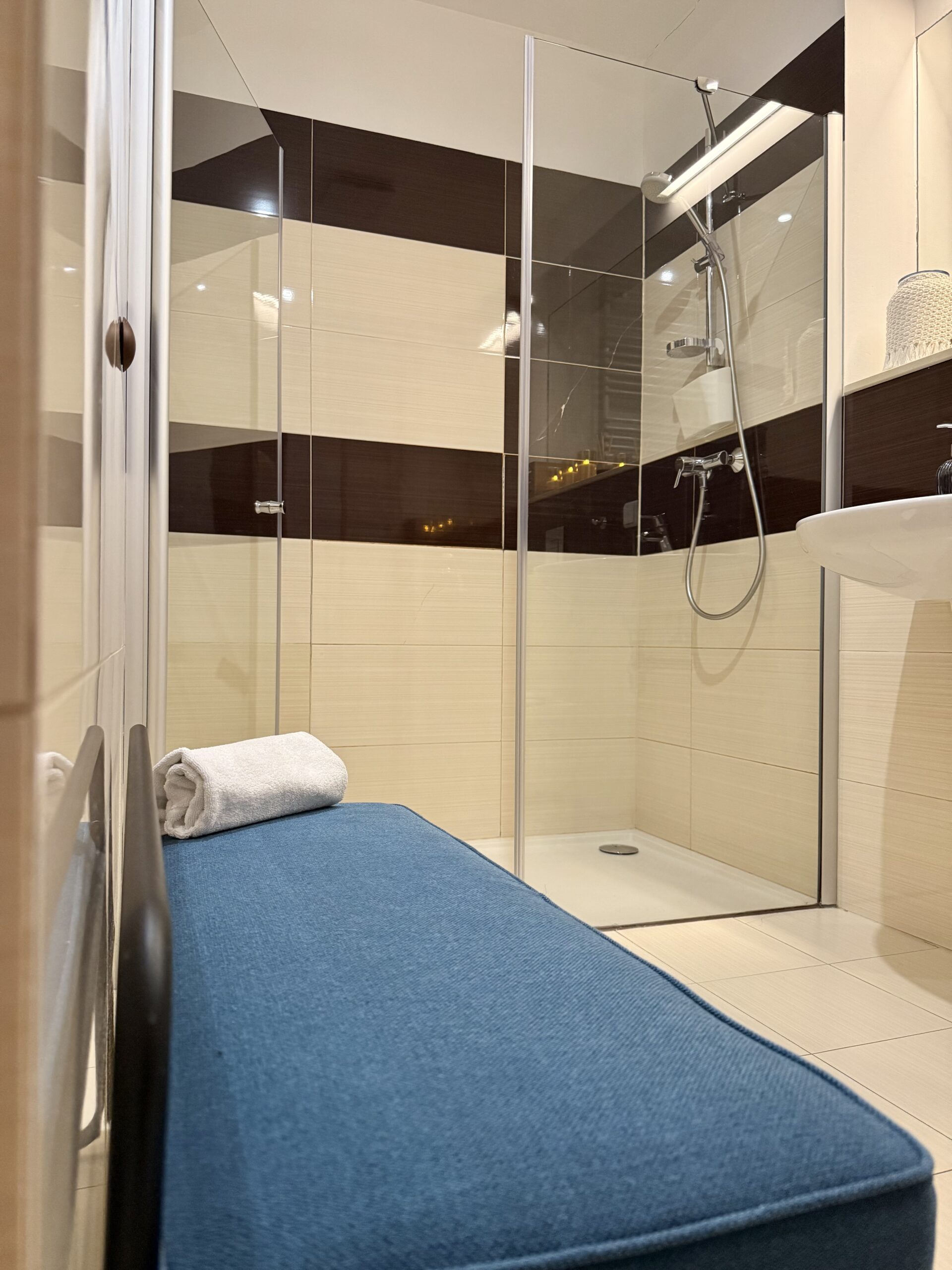Apartament dysponuje również dużą, jasną łazienką z pralką, co jest szczególnie wygodne podczas dłuższych pobytów.