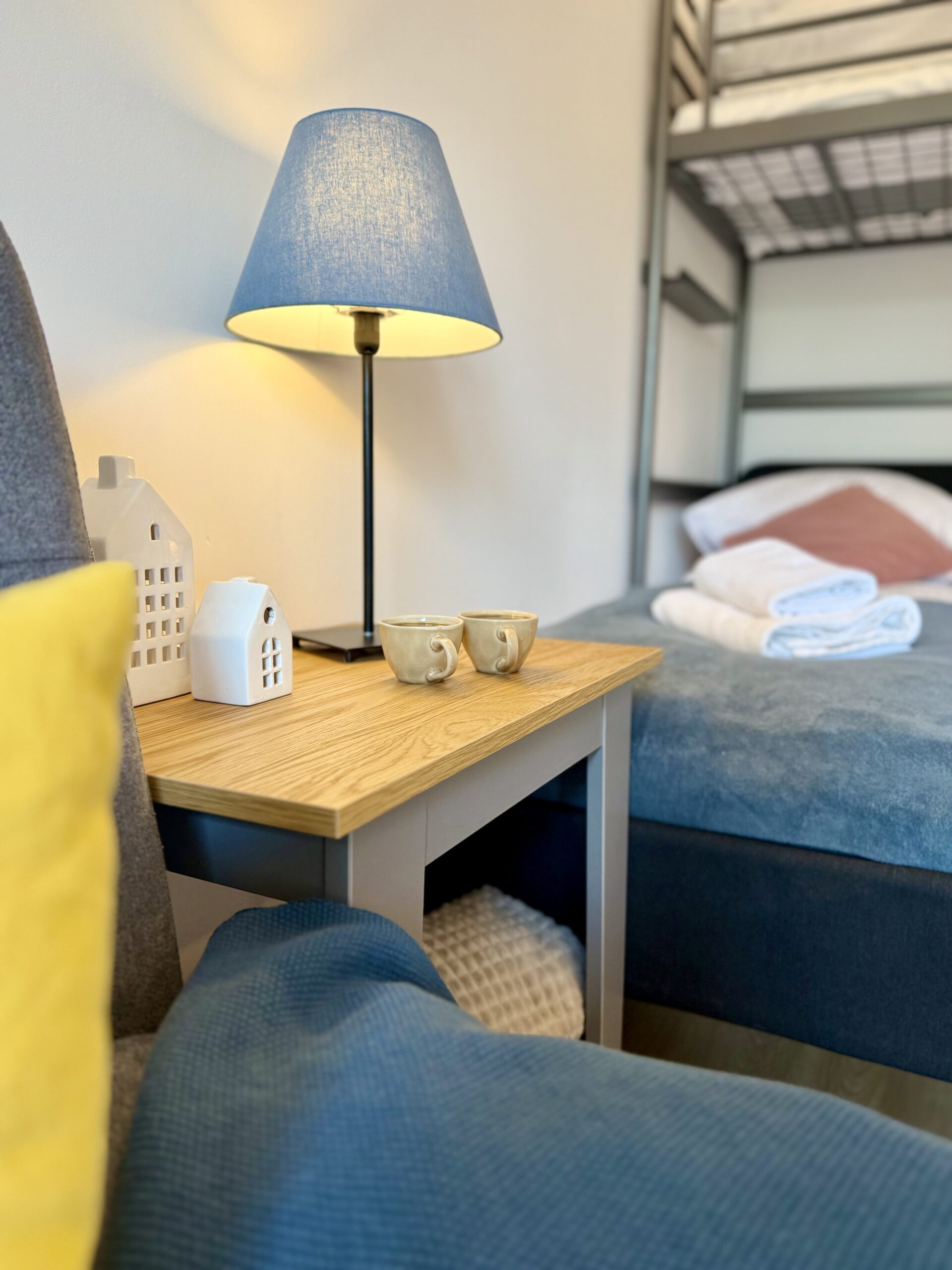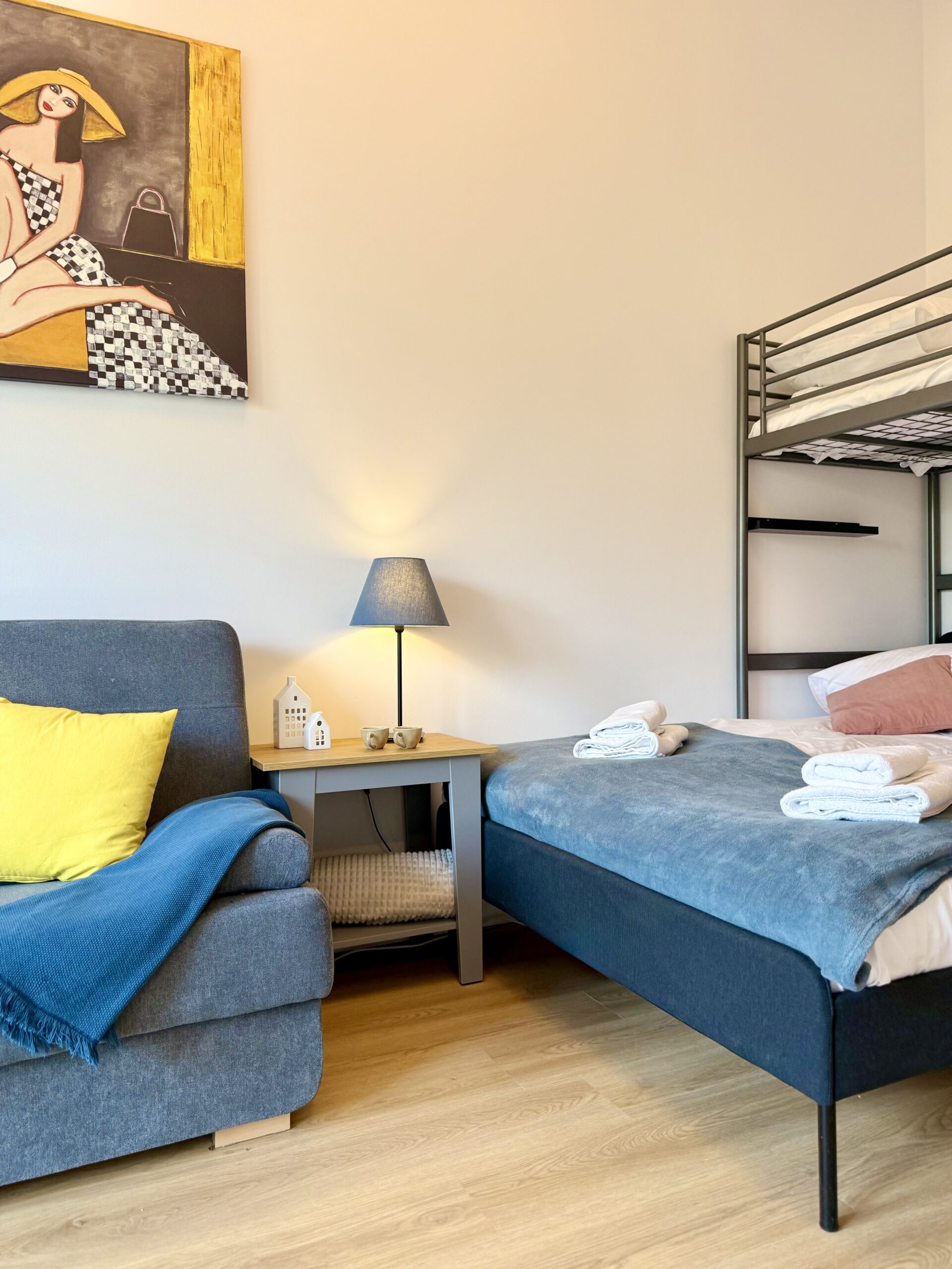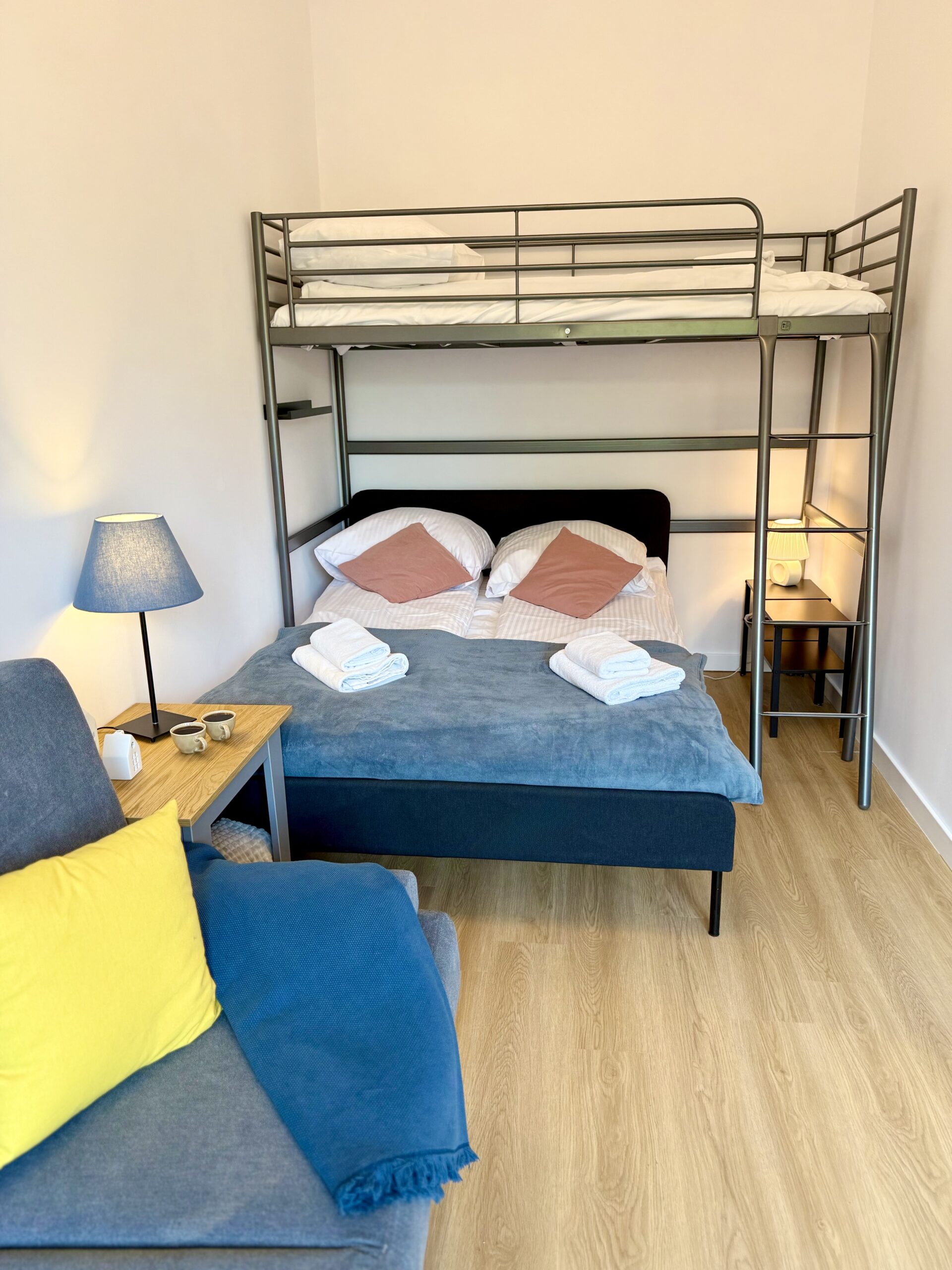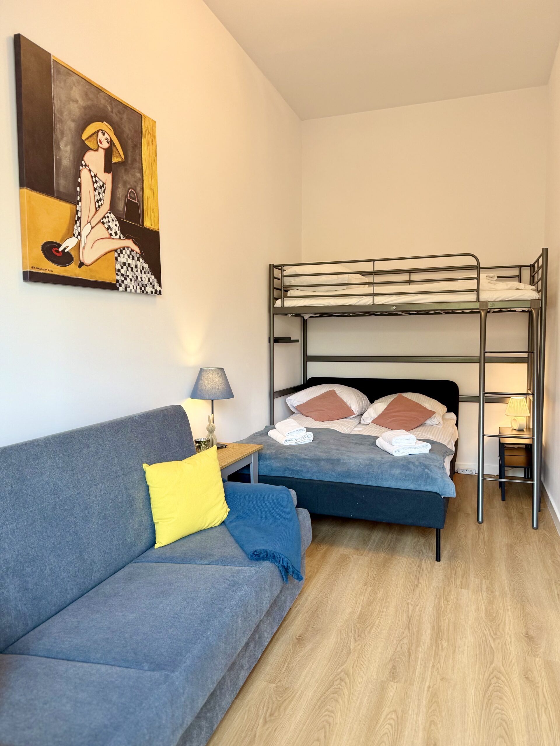 W sypialni znajdują się: łóżko małżeńskie, łóżko piętrowe dla jednej osoby oraz rozkładana sofa. W salonie dostępna jest dodatkowa rozkładana sofa, co zapewnia wygodne miejsca noclegowe dla kilku osób.