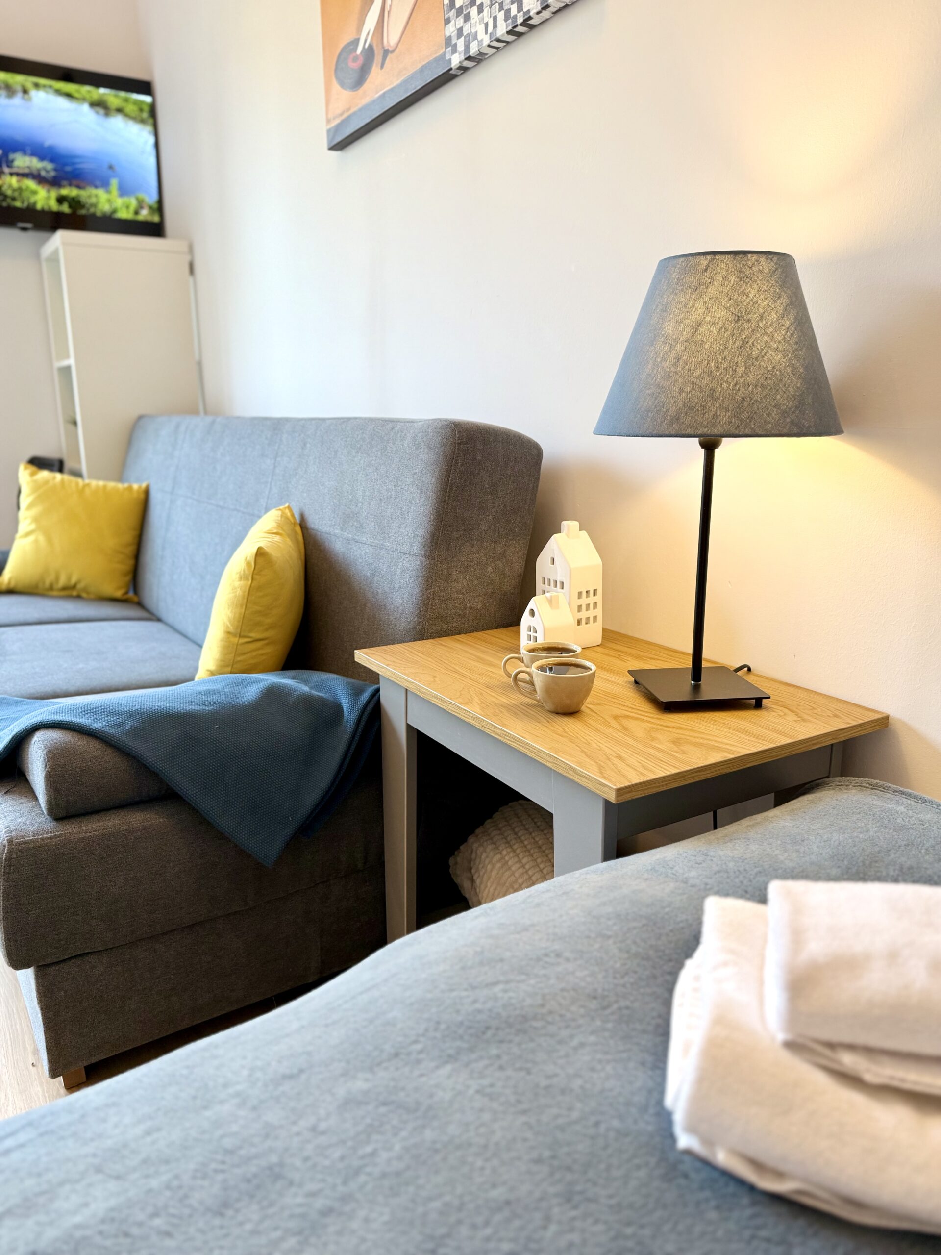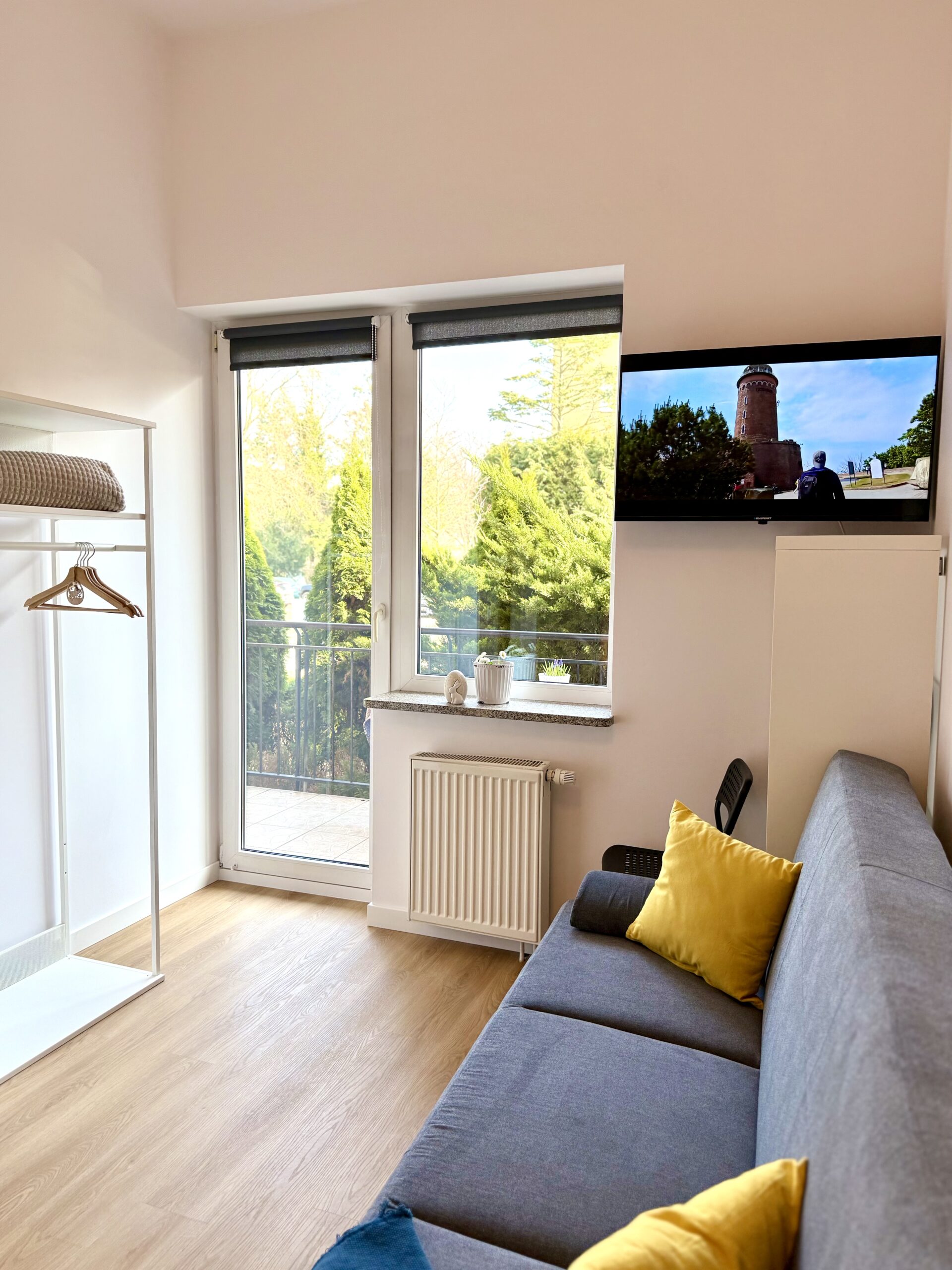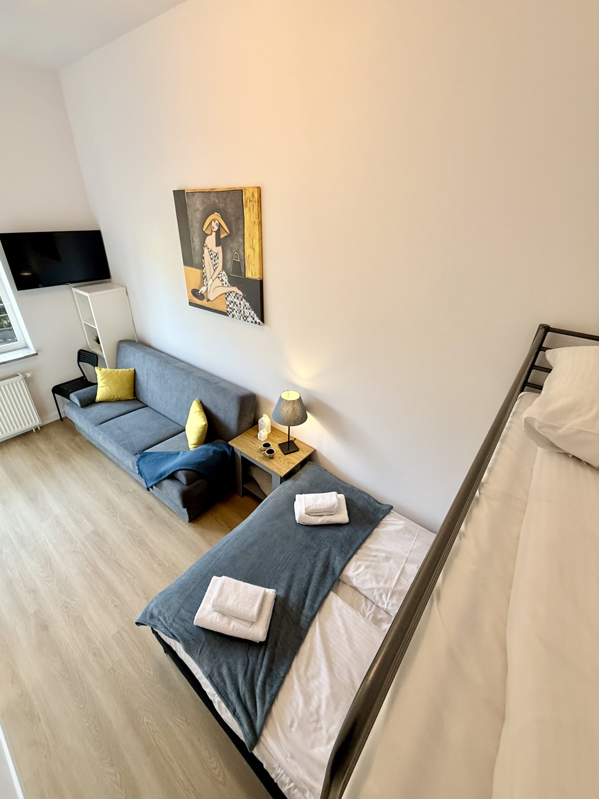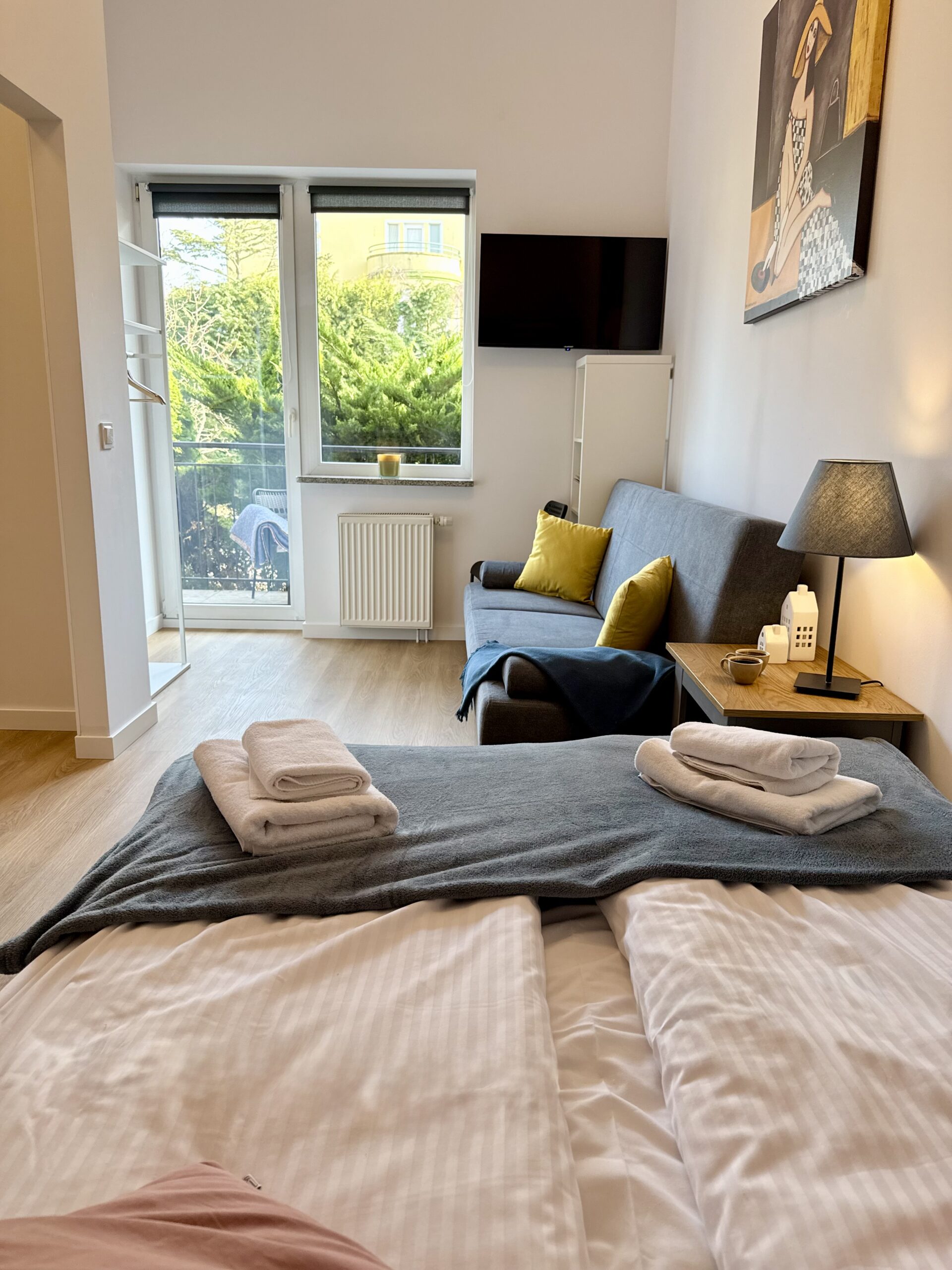 W apartamencie znajduje się część wypoczynkowa z telewizorem z płaskim ekranem, pralka oraz zestaw do parzenia kawy i herbaty. Drewniana podłoga nadaje wnętrzu przytulny charakter, a z okien roztacza się widok na cichą ulicę, co sprzyja spokojnemu wypoczynkowi.