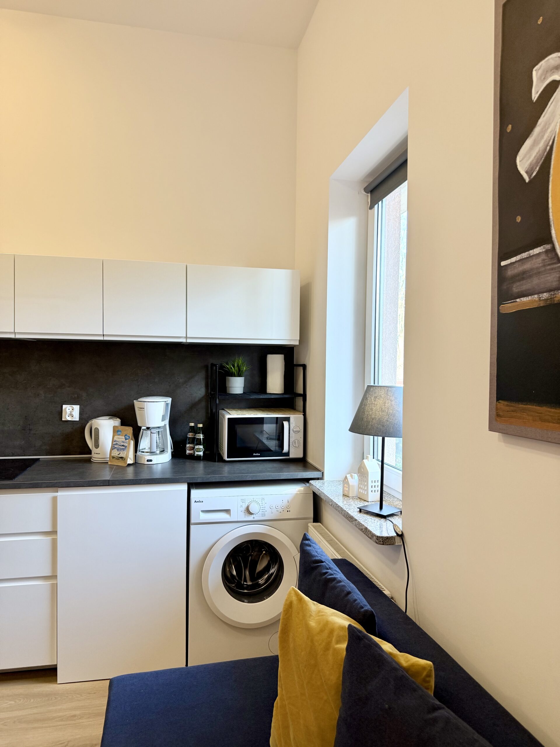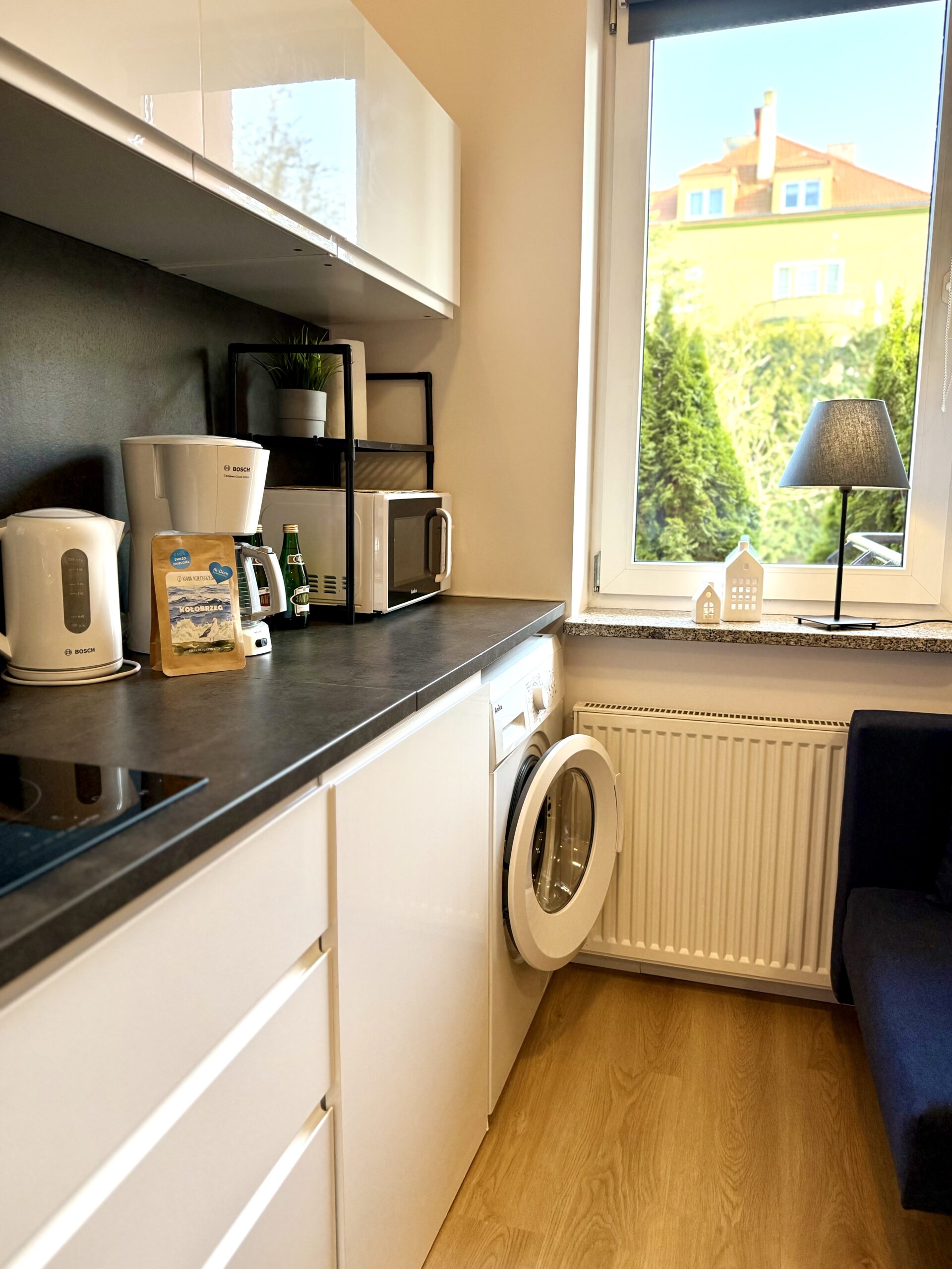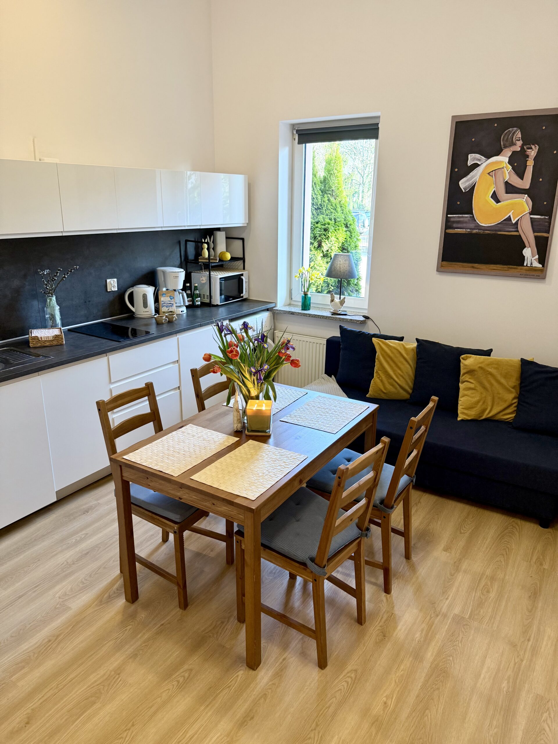 W apartamencie znajduje się część wypoczynkowa z telewizorem z płaskim ekranem, pralka oraz zestaw do parzenia kawy i herbaty. Drewniana podłoga nadaje wnętrzu przytulny charakter, a z okien roztacza się widok na cichą ulicę, co sprzyja spokojnemu wypoczynkowi.